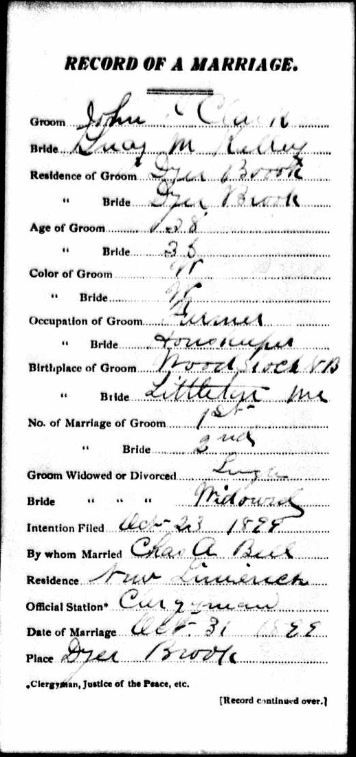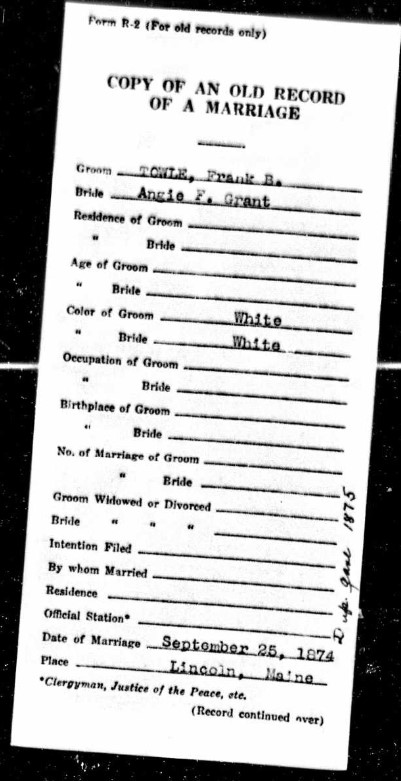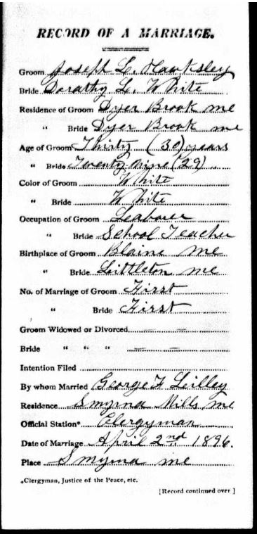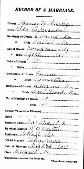 Shirley S. Ingalls was born in Grand Maran, New Brunswick, Canada on 25th of January in 1900. She was the 7th of 11 children of Ross H. Ingalls and Maud Francenia Lakenson. According to the 1910 U.S. Federal Census, the Ingalls family lived in New Brunswick until 1902, when they emigrated to the United States and settled in Lubec, Washington County, Maine. Ross Ingalls was a sailor and although listed with his family, was more often at sea. Shirley, herself, has no biological connection to the Grant or Lilley family, that I can find. Her only connection is through her husband, Benjamin Theodore Marley.