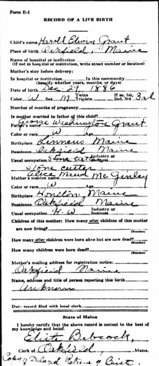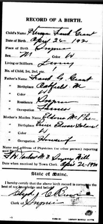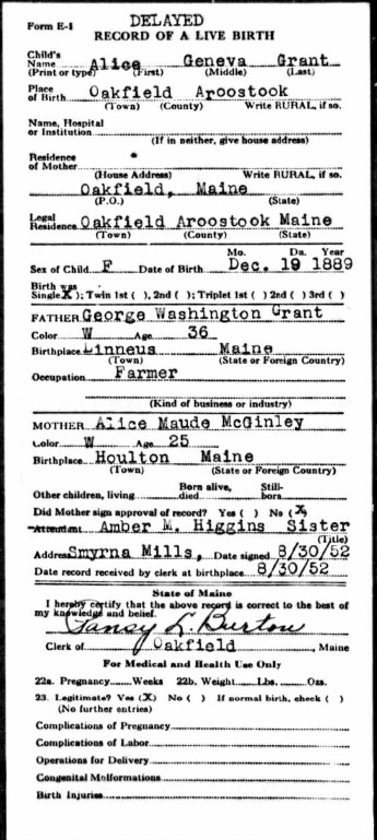Nadine Brown was born on 23rd of June 1912 in Merrill, Aroostook County. She was the 2nd child and eldest daughter of Harold G. Brown and June G. Clark. As stated earlier, she is the grandniece of the husband of my 2nd great-grandaunt. Her connection to the Grant and Lilley family is through her grandmother, Lizzy Velour Lilley.