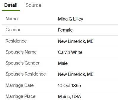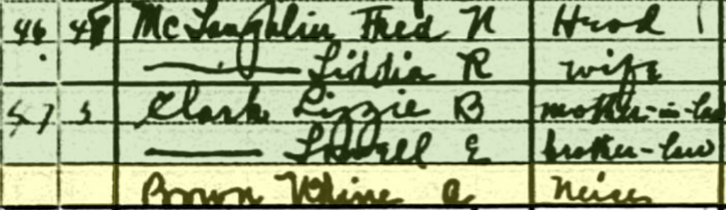 On the 1920 U.S. Federal Census, Nadine is listed on 2 separate census reports. The first has her listed with her family (parents and five children), living in Presque Isle, Aroostook County. The second listing has her living with her aunt and uncle, Fred and Lydia (Clark) McLaughlin in Merrill, Aroostook County. Also listed on that same report is Nadine’s grandmother Lizzy (Lilley) Clark and her uncle Lowell E. Clark.