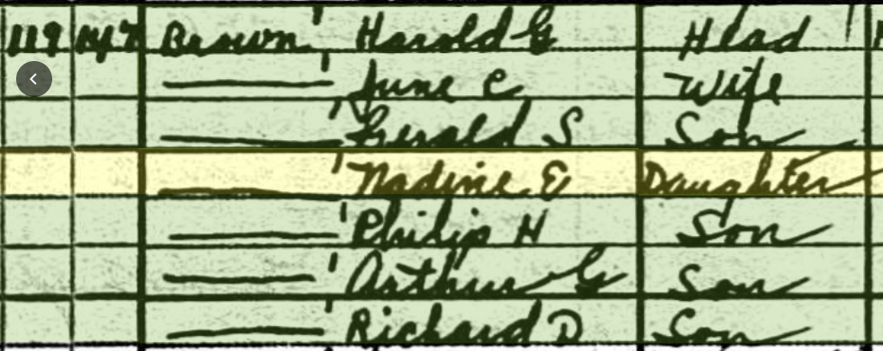 The next two names on the list are sister and brother, Nadine and Arthur Brown. They are both listed in Ancestry.com as related to my 2nd Great-grandaunt, Nellie O. (Gardner) and her husband George F. Lilley. Their connection is directly through George, as their grandmother, Lizzy Velour Lilley is his sister.