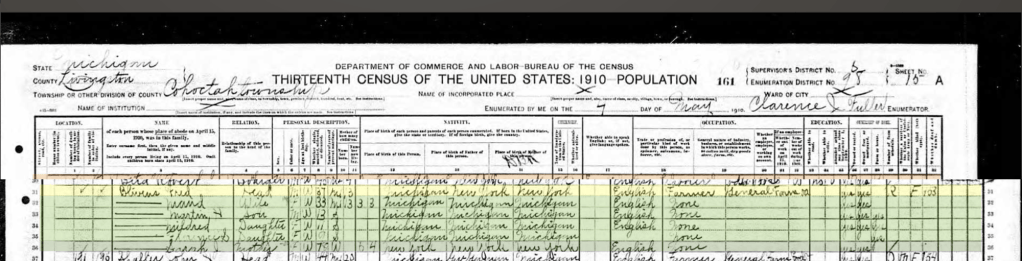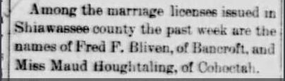 Sometime between their marriage and the 1900 U.S. Federal Census, the newly created Bliven family left Livingston County and located in neighboring Shaiwassee County.