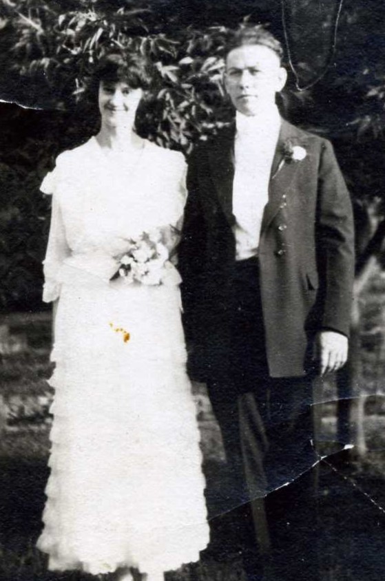 My grandmother Margaret (aka Peggy) married Fed and Maude’s son Martin on 26 Jun 1920. This photo was taken after the wedding, in the front yard of 808 Center Street.