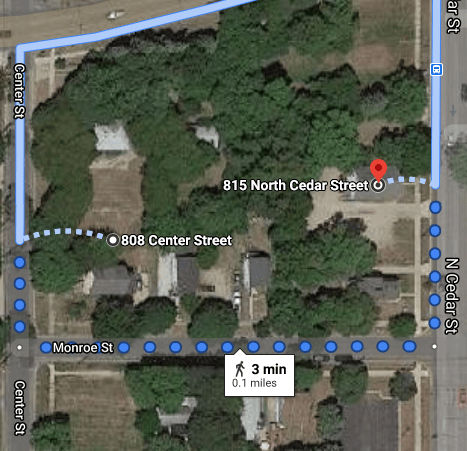 Apparently, I had driven past this home numerous times and not realized that it was also a former residence of my family. Below is what came up when I asked Google Maps to give directions from 815 N. Cedar Street to 808 Center Street.